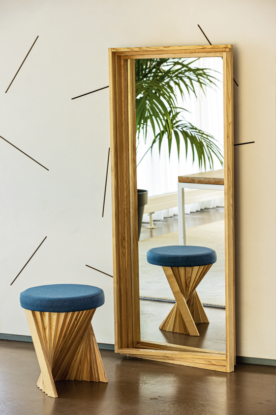 The frame of this vertical mirror, made from the use of solid wood strips that create a three- dimensional and dynamic motif, is an expression of an exclusive aesthetic and technical concept.