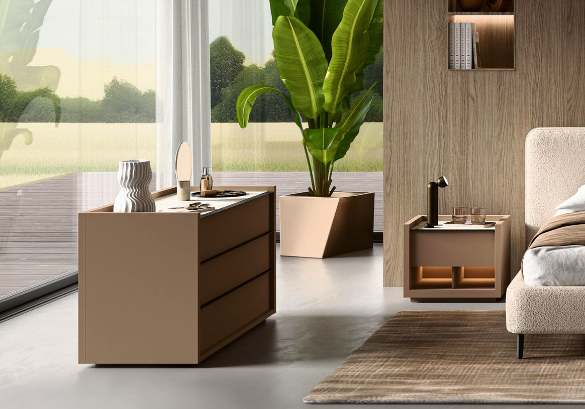 Una cassettiera e un comodino dalle proporzioni generose, definiti da linee orizzontali e da un'audacia decisa. Il profilo elegante e gli ampi scomparti bilanciano il peso visivo con la funzionalità quotidiana.