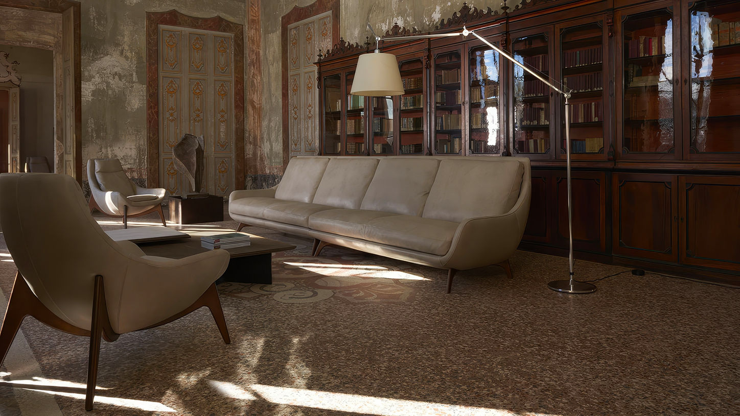 The sofa has a distinctive curved shape that evokes a sense of architectural beauty. More than just a beautifully defined shape, the upholstery backrest is also a perfectly angled supporting element wrapped in a high quality fabric that is incredibly soft and smooth.